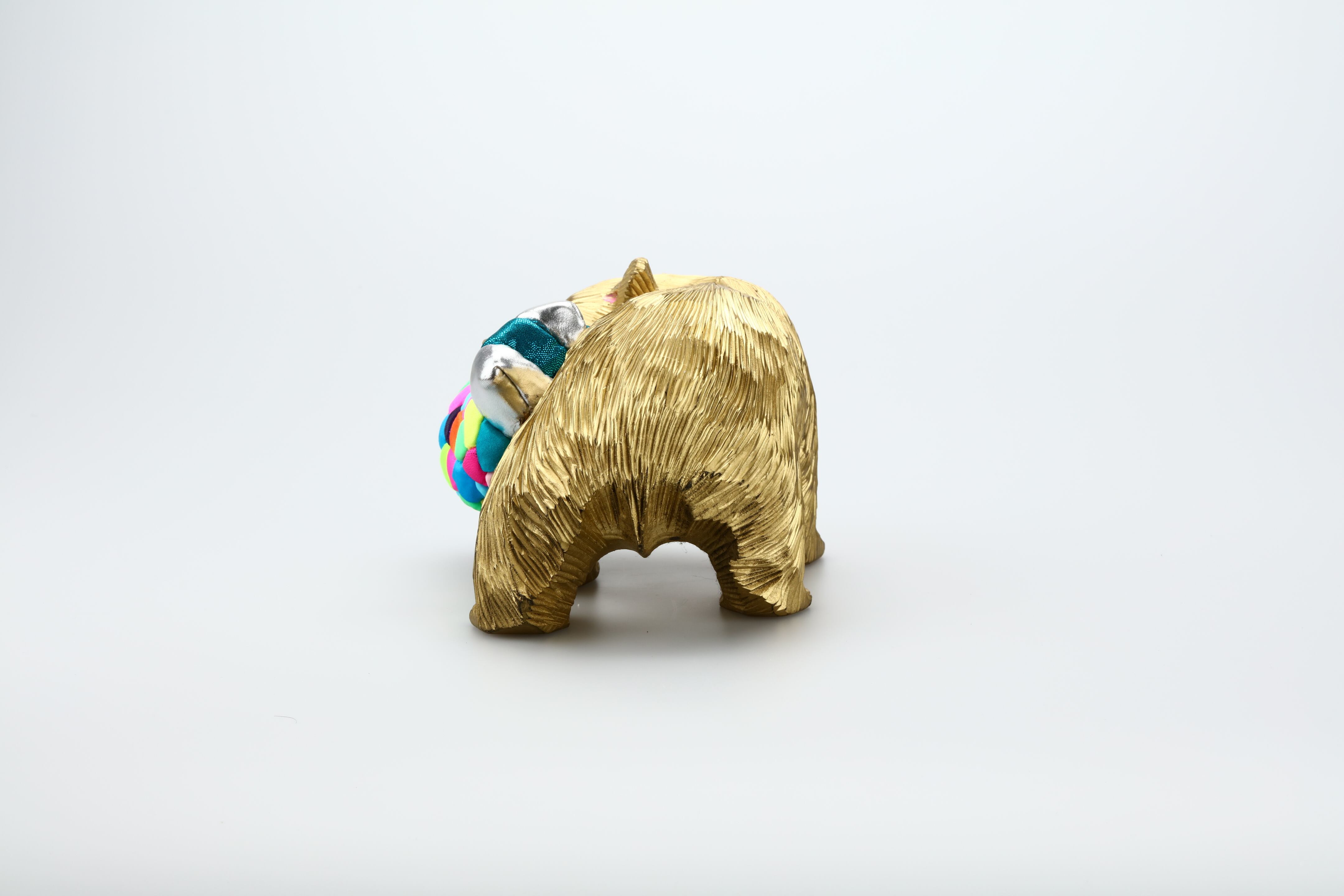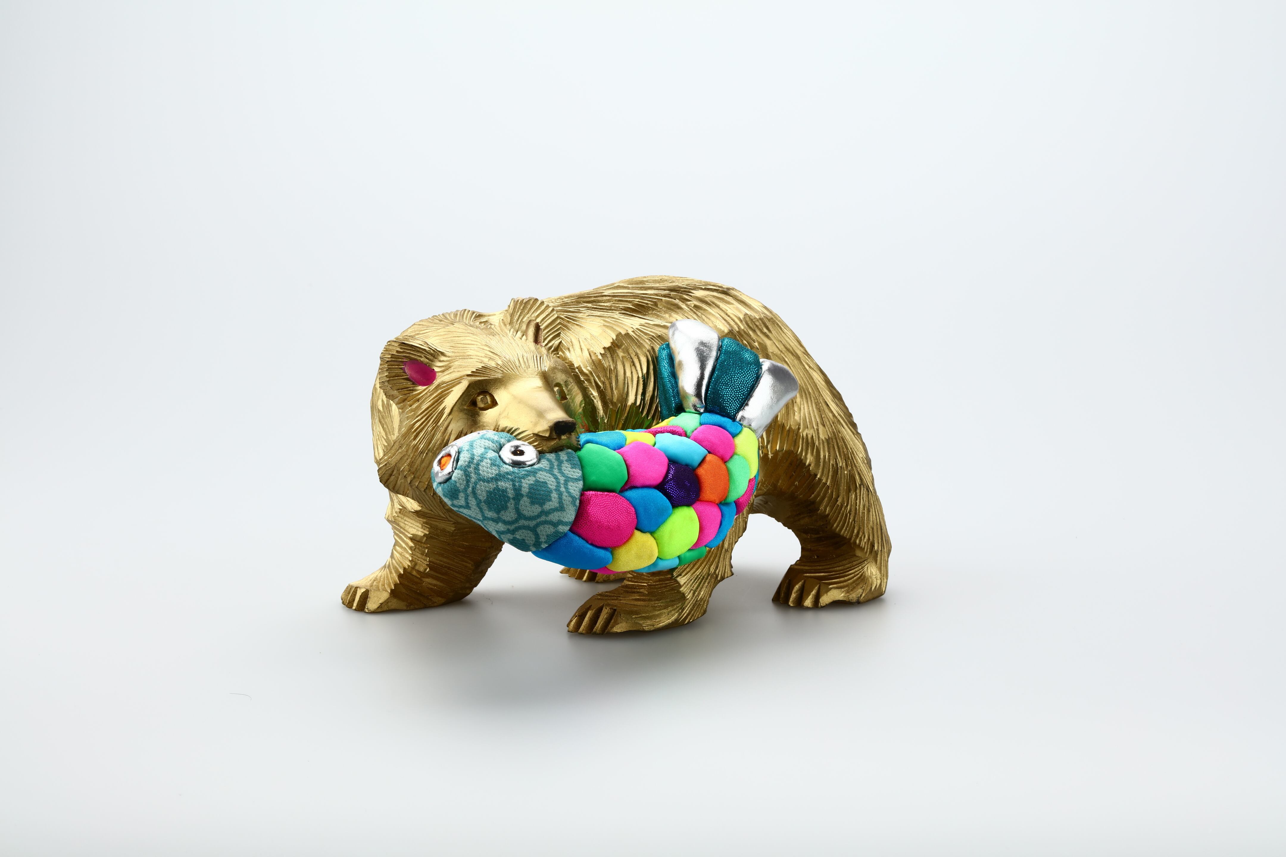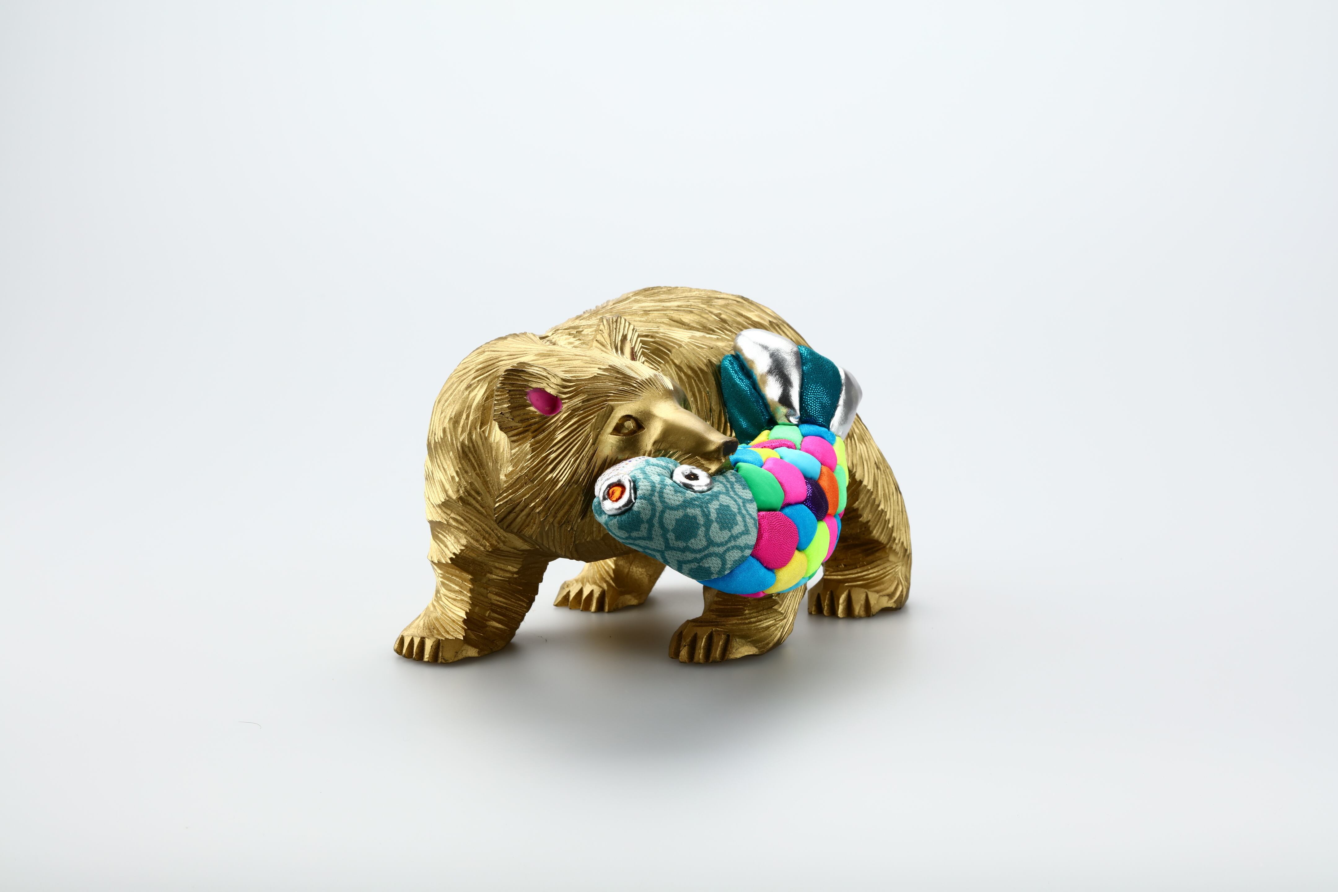 伝統的なアイヌ文化においては「リアルに象られた物は、魂を持って悪さをする」との考えがあると言います。かつて民芸品として、もてはやされた木彫りの熊はこの思想から少しデフォルメされ可愛い表情をしています。今回の作品は、廃材生地を使って作るキメコミアートの技法を使ったカラフルな魚を咥えた新しい作品になりました。ポップでポジティブな魂が吹き込まれてに元気生まれ変わりました。
