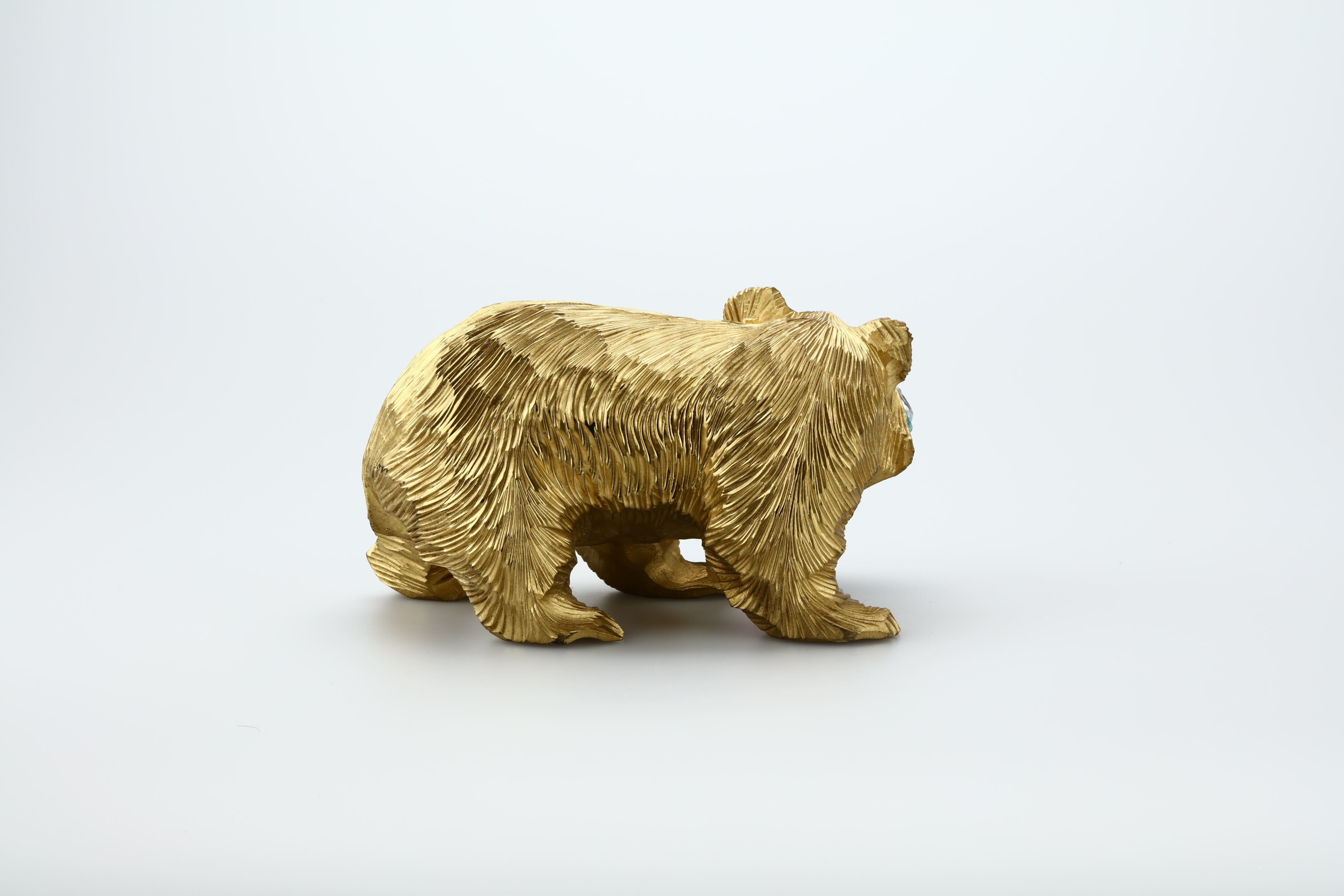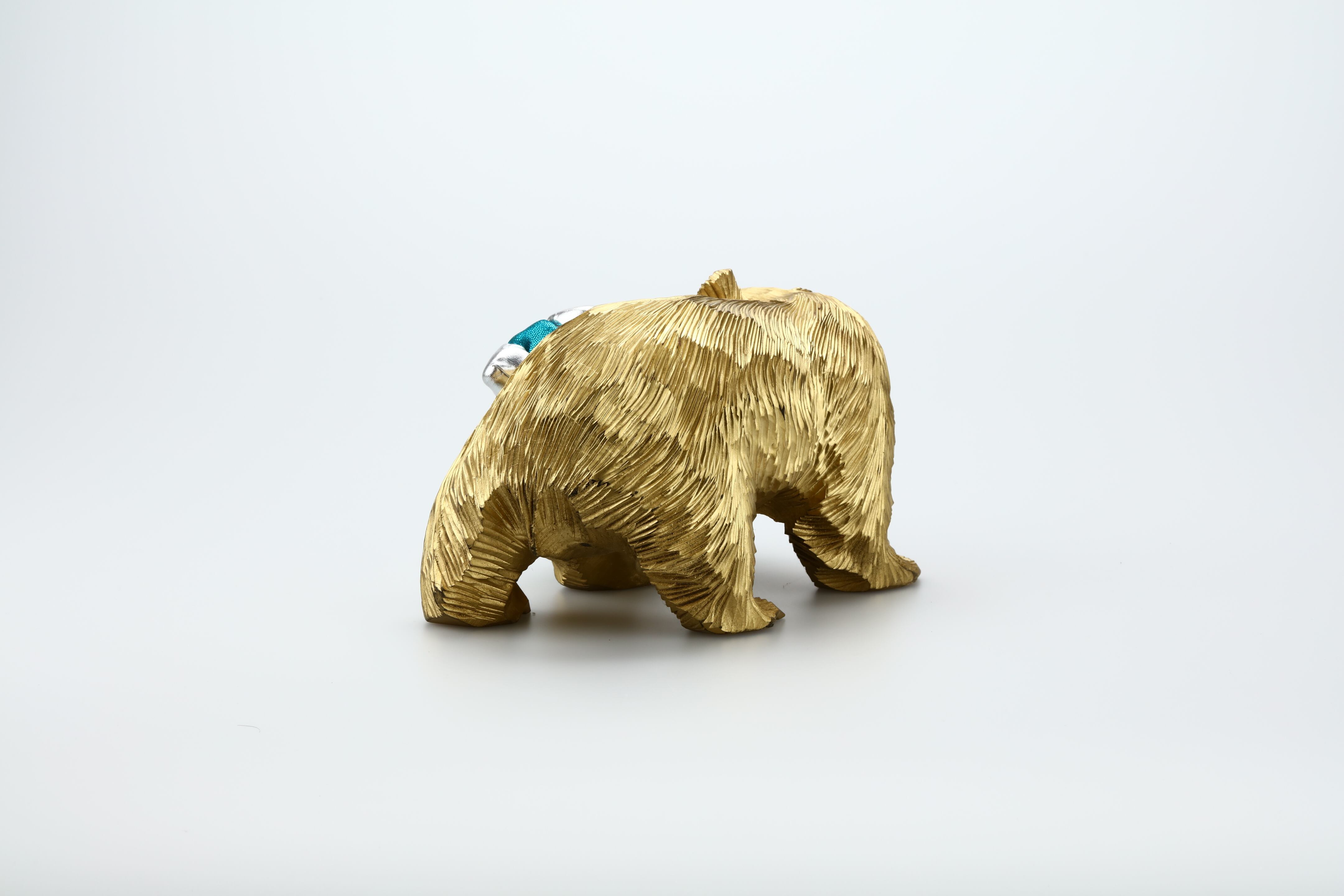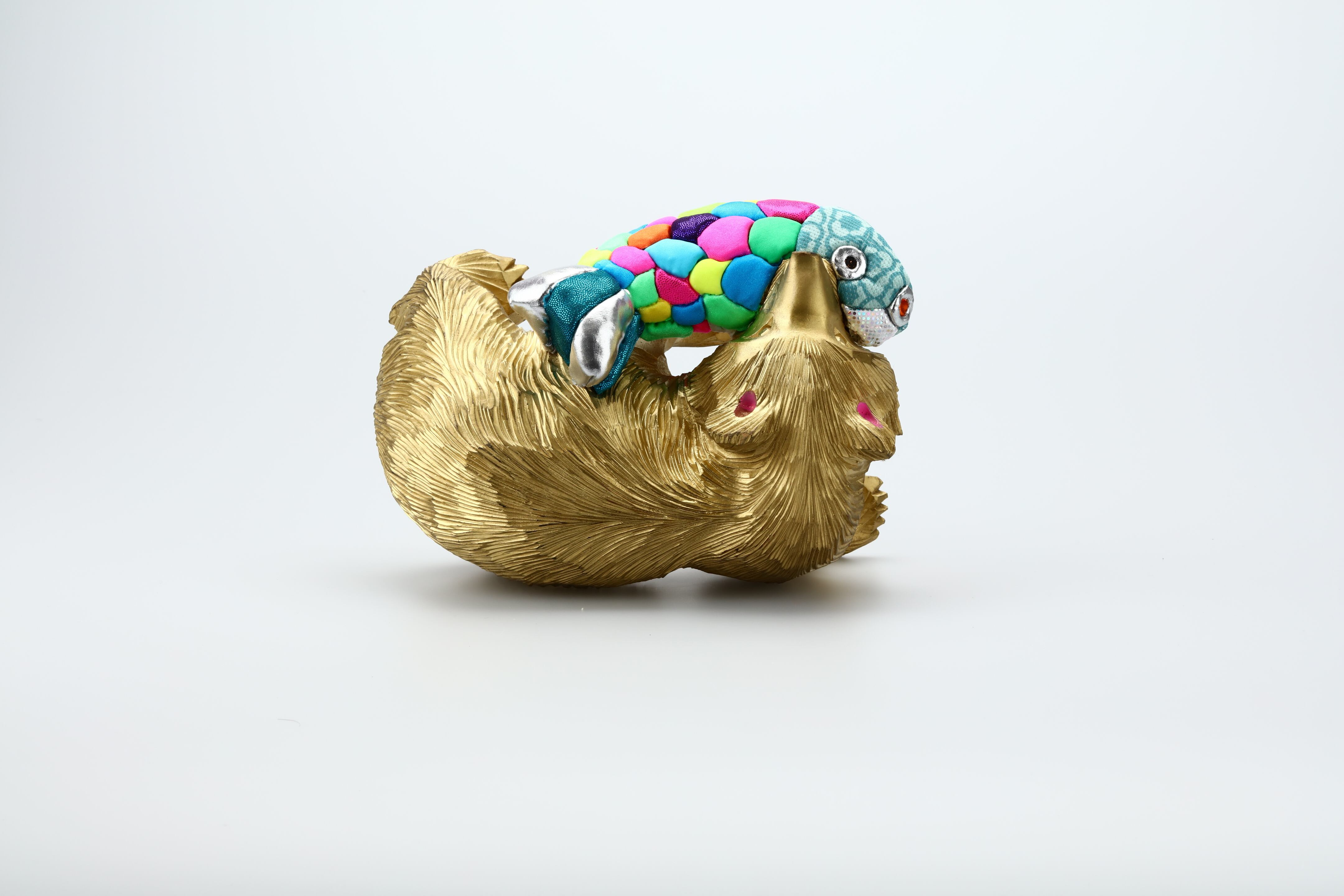 伝統的なアイヌ文化においては「リアルに象られた物は、魂を持って悪さをする」との考えがあると言います。かつて民芸品として、もてはやされた木彫りの熊はこの思想から少しデフォルメされ可愛い表情をしています。今回の作品は、廃材生地を使って作るキメコミアートの技法を使ったカラフルな魚を咥えた新しい作品になりました。ポップでポジティブな魂が吹き込まれてに元気生まれ変わりました。